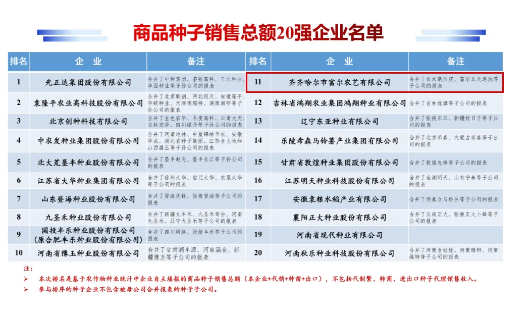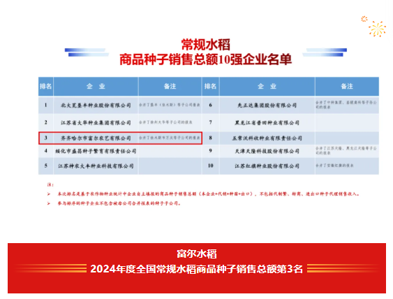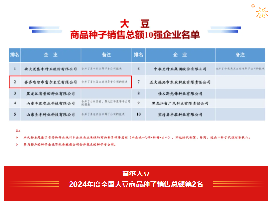 9月27日,第十七屆中國(guó)國(guó)際種業(yè)博覽會(huì)暨第二十二屆全國(guó)種子信息交流與產(chǎn)品交易會(huì)種業(yè)信息發(fā)布會(huì)在山東青島召開(kāi)。會(huì)上,發(fā)布了2024年度全國(guó)農(nóng)作物種業(yè)企業(yè)銷(xiāo)售信息和2024年度主要糧油和特色作物推廣面積前十大品種。富爾農(nóng)藝經(jīng)營(yíng)業(yè)績(jī)表現(xiàn)亮眼,繼續(xù)穩(wěn)居全國(guó)前列:農(nóng)作物商品種子銷(xiāo)售總額位列全國(guó)第11位;大豆商品種子銷(xiāo)售總額位列全國(guó)第2名;常規(guī)水稻商品種子銷(xiāo)售總額位列全國(guó)第3名;旗下明星品種“東生22”大豆位列2024年度全國(guó)推廣面積前10。